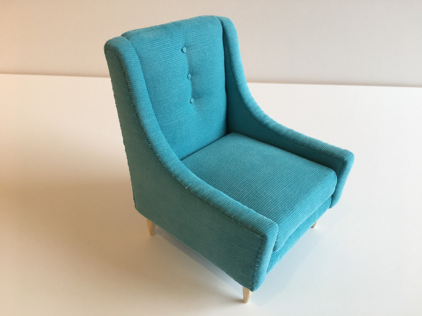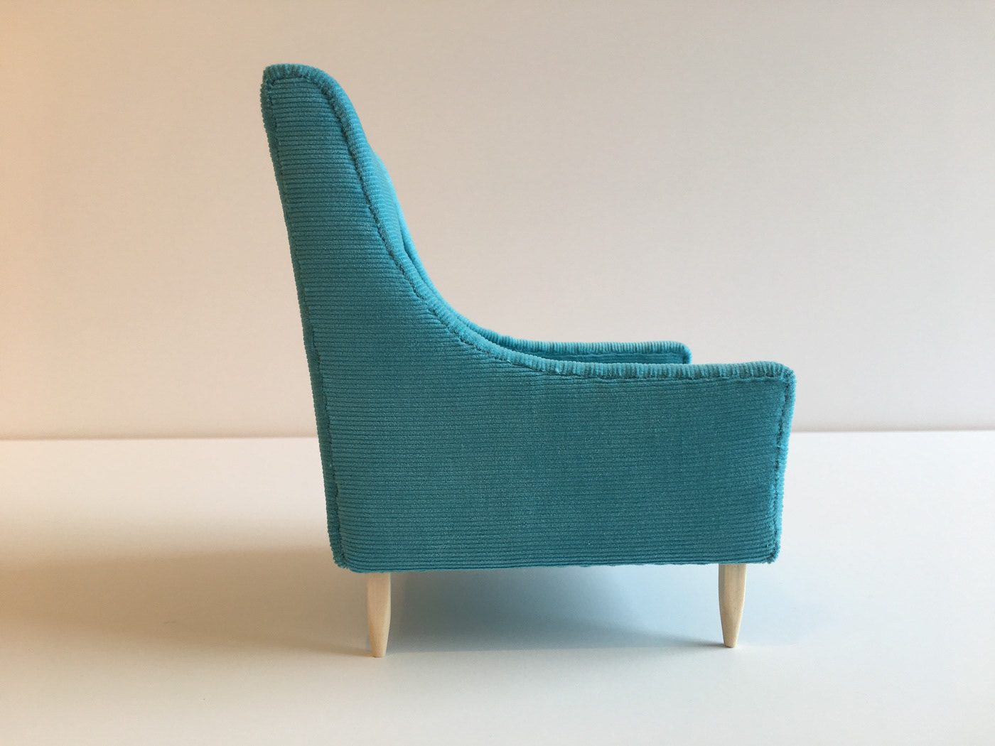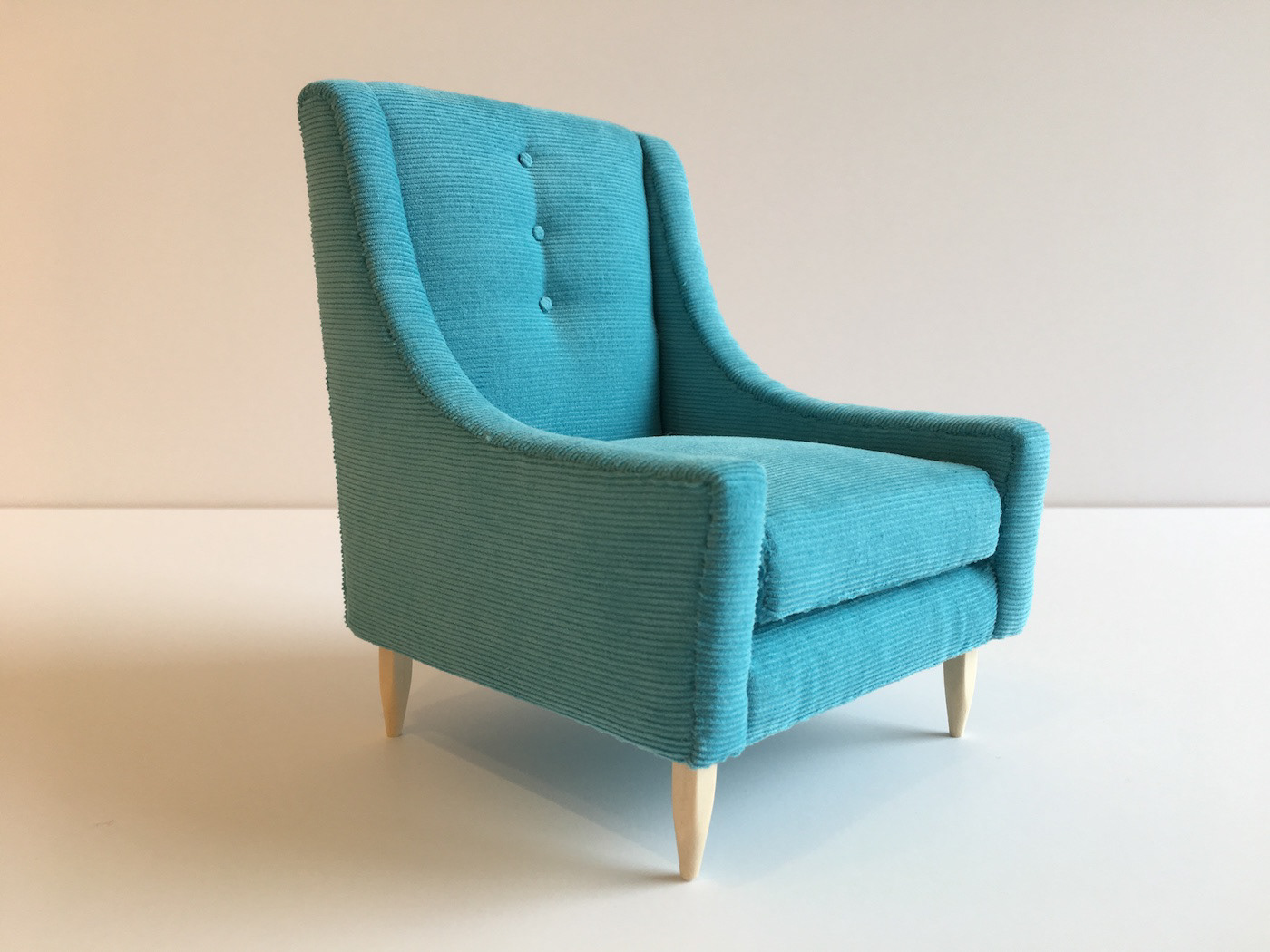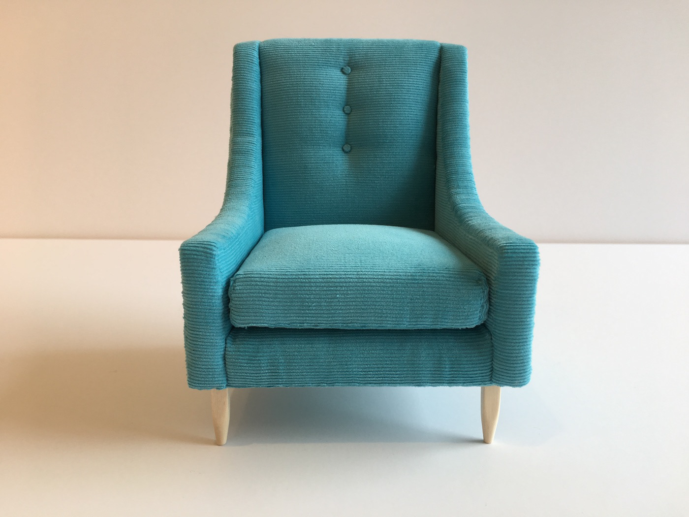 This model is upholstered in a fine-wale aqua corduroy fabric. Swoop arms for comfort, classic three-button tufted back, removable seat cushion and natural hand-finished legs complete the look. Dimensions: 6.25"H x 5.5"D x 4.75"W