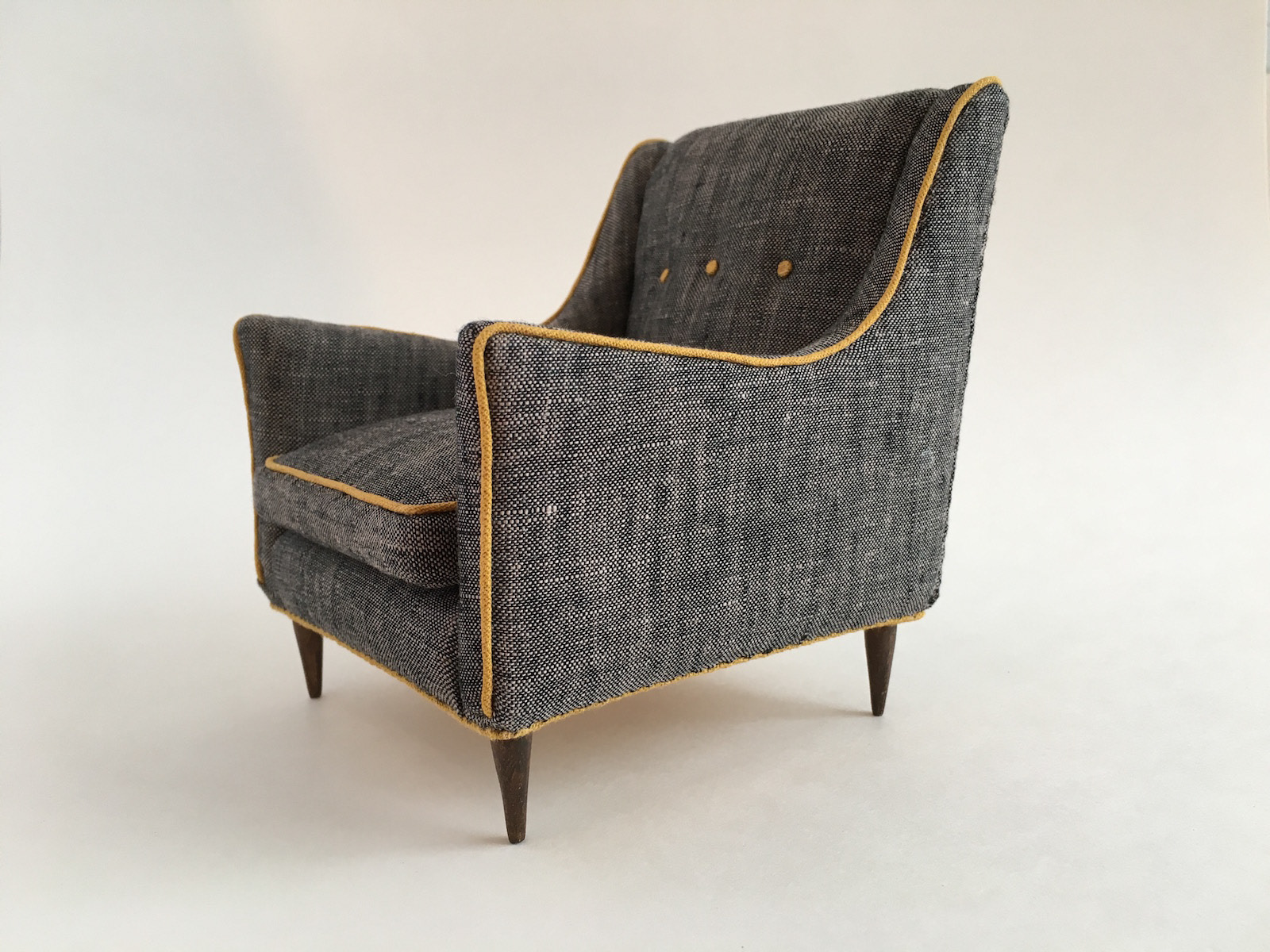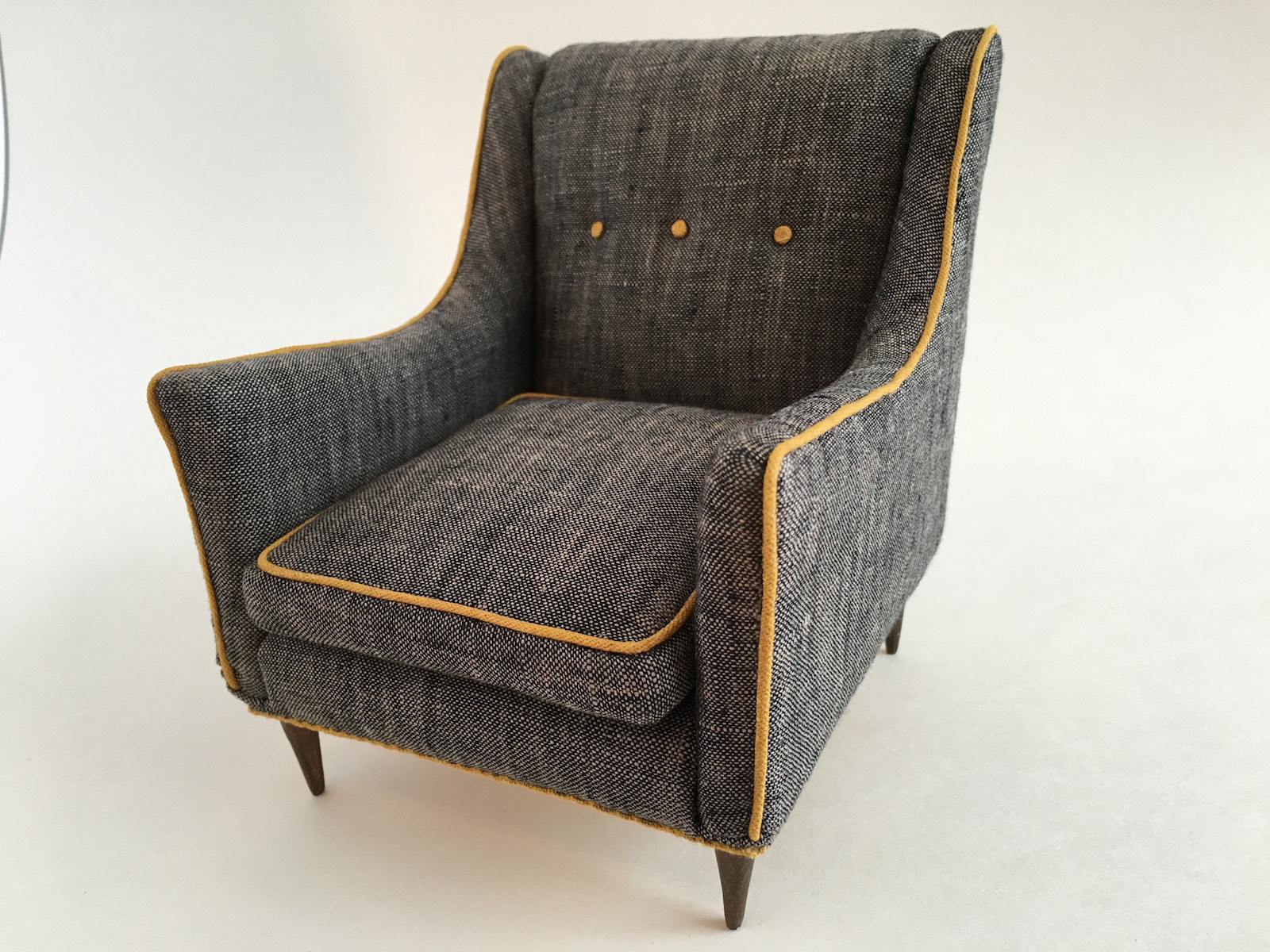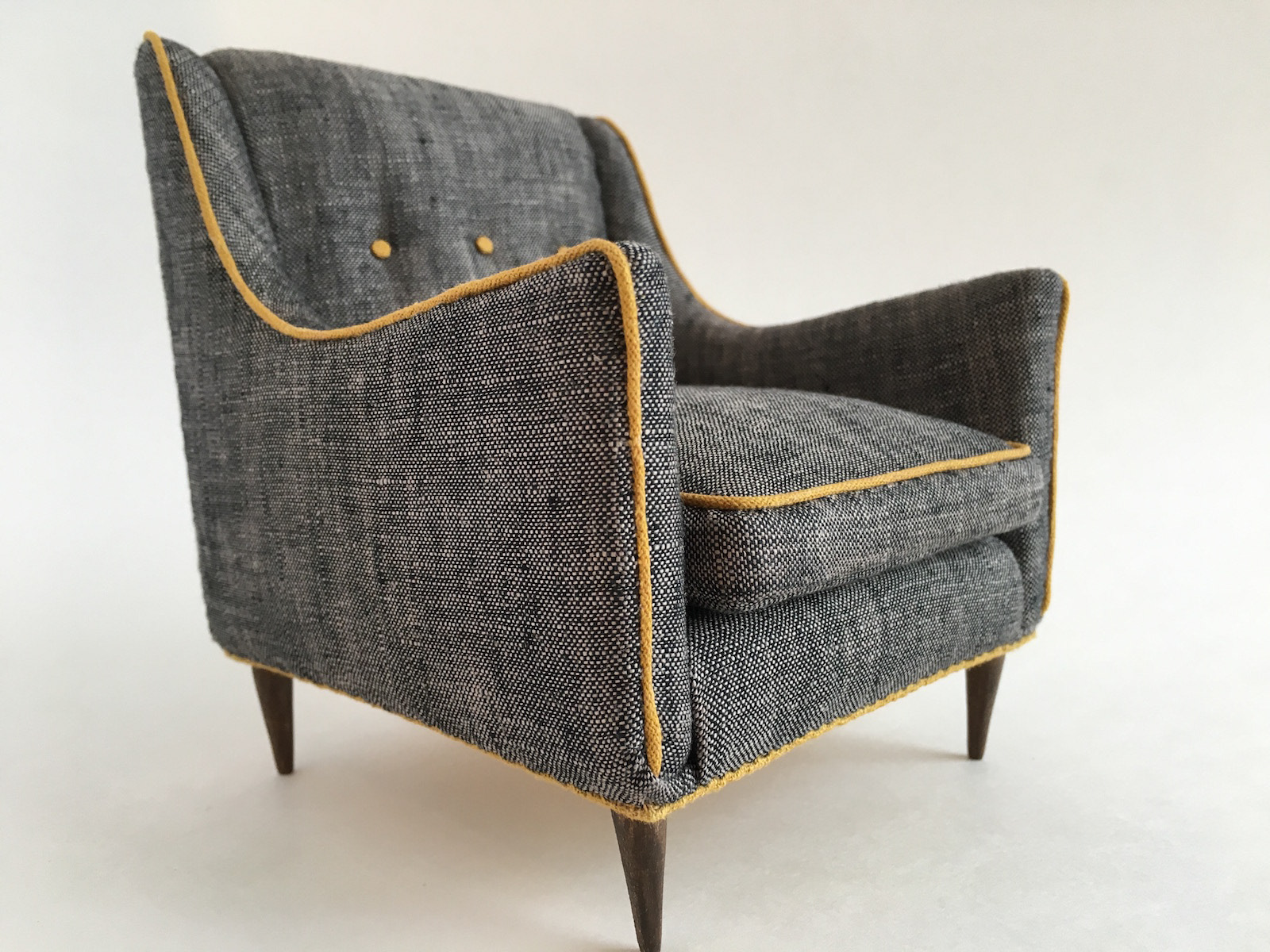 A limited edition model in black and yellow-gold. Details include a removable seat cushion, stained, hand-turned legs, contrasting piping, durable linen fabric, and a tufted back. Dimensions: 4.75"W x 5"D x 5.75"H