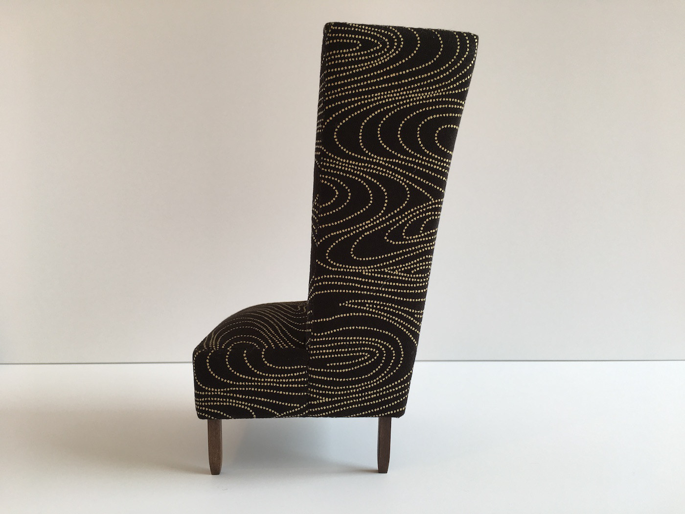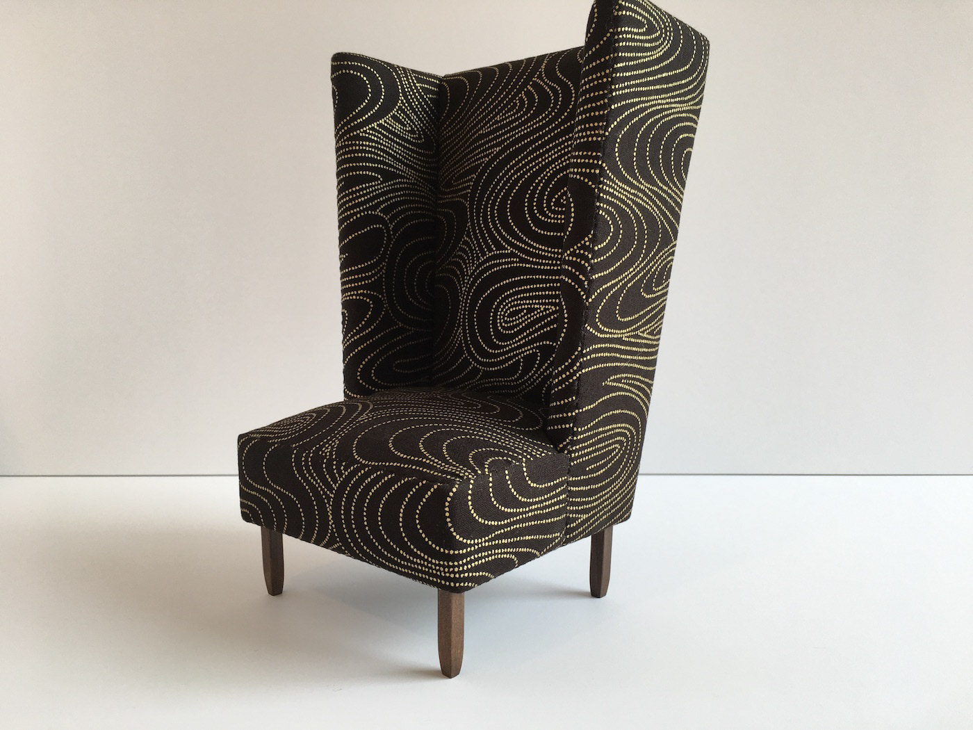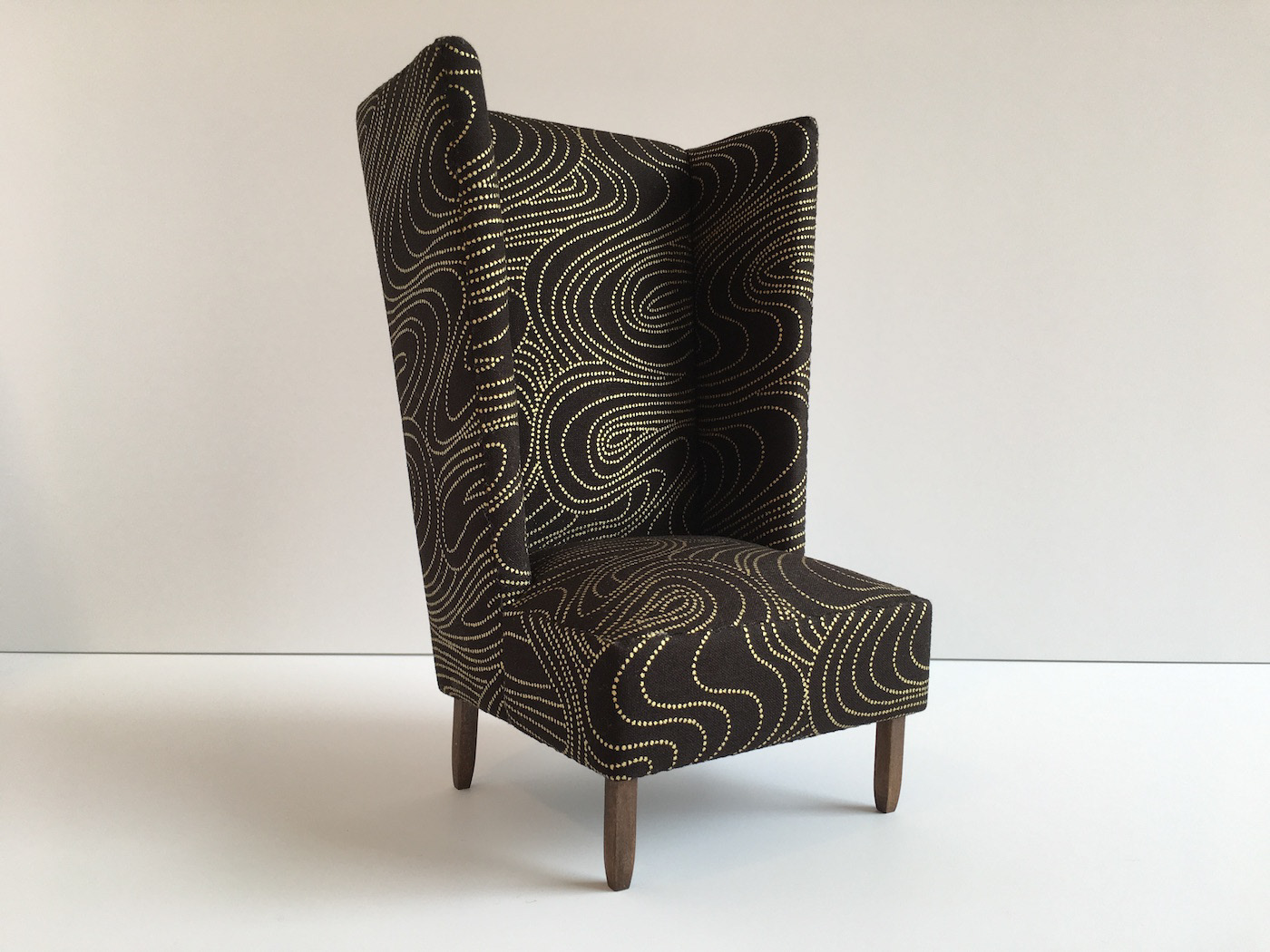Black and gold printed cotton fabric with walnut stained bass wood legs. Dimensions 9" H x 5.5" D x 5.75" W