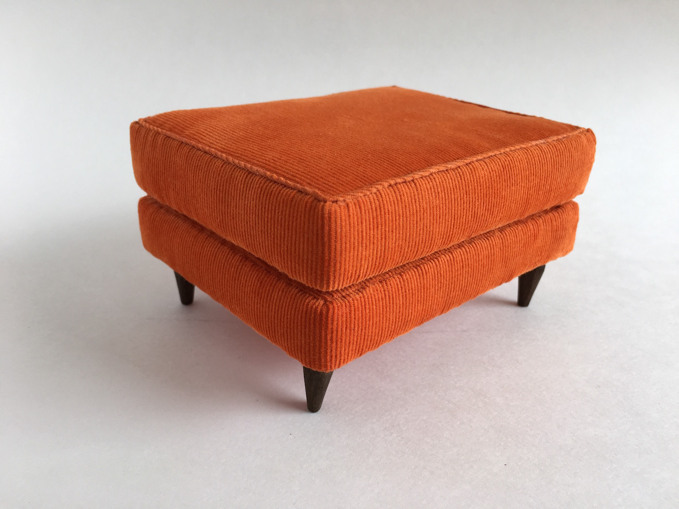 Crafted in fine wale orange corduroy with piping and beautiful walnut stained legs, this item works well in many settings. The cushioned top is a welcome rest for tired feet. It can also double as a small backless sofa. Dimensions: 5.5"x4.25"x2.75"H