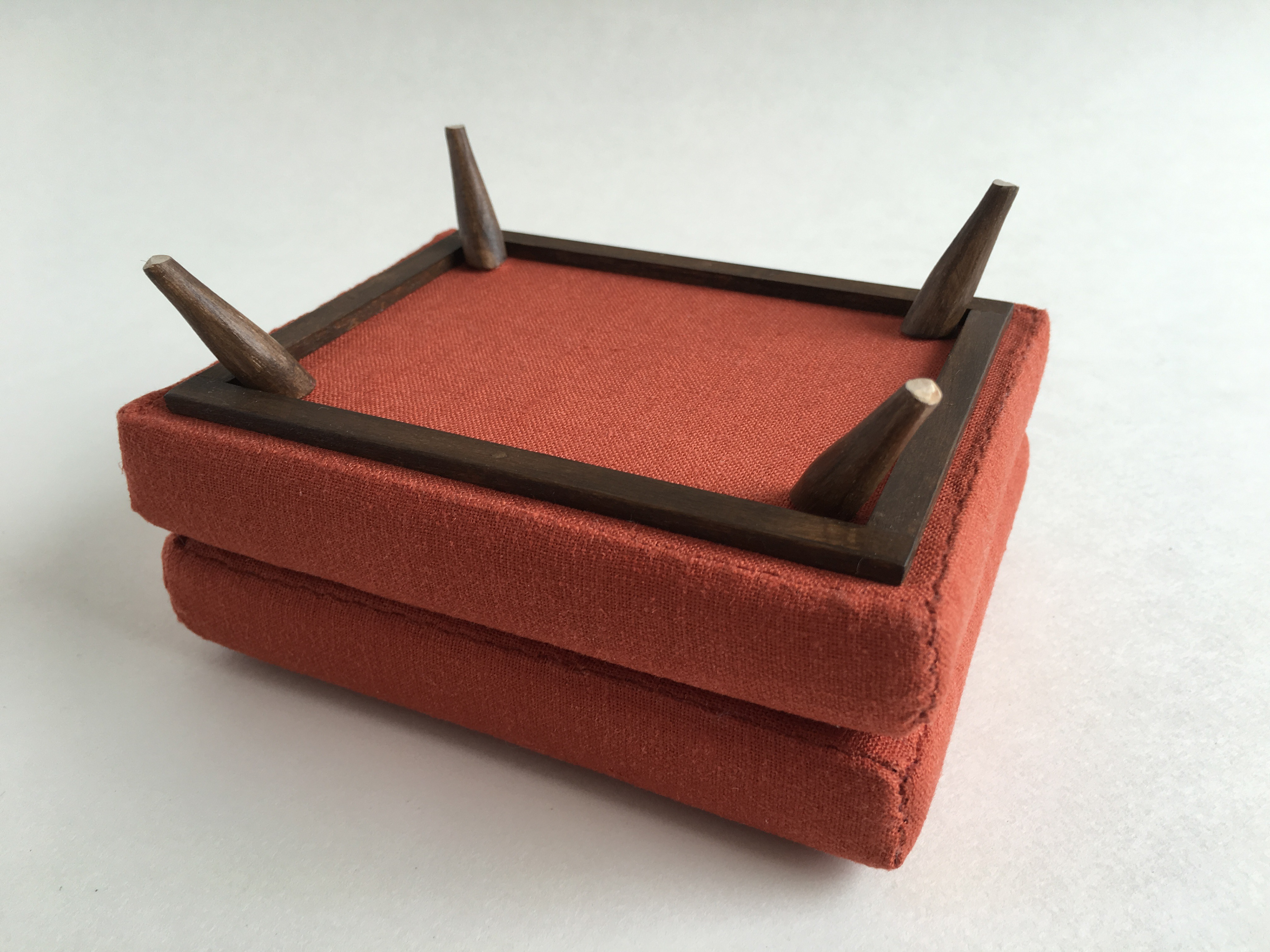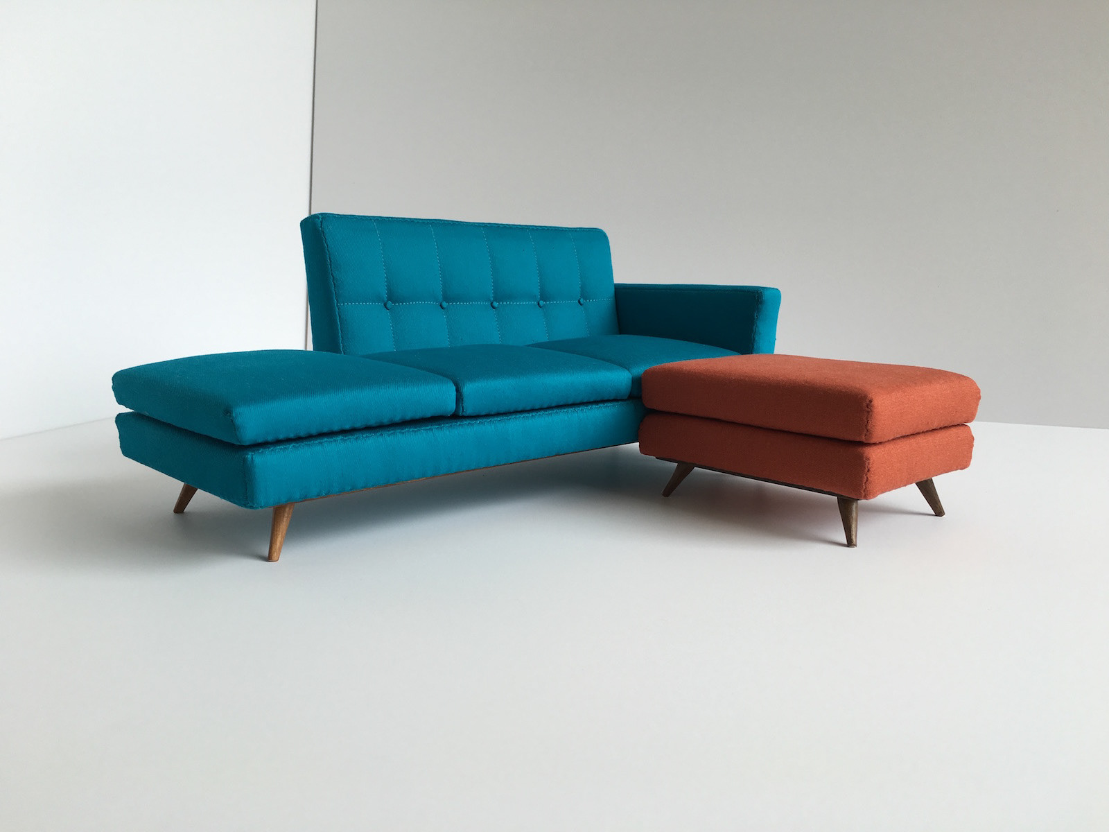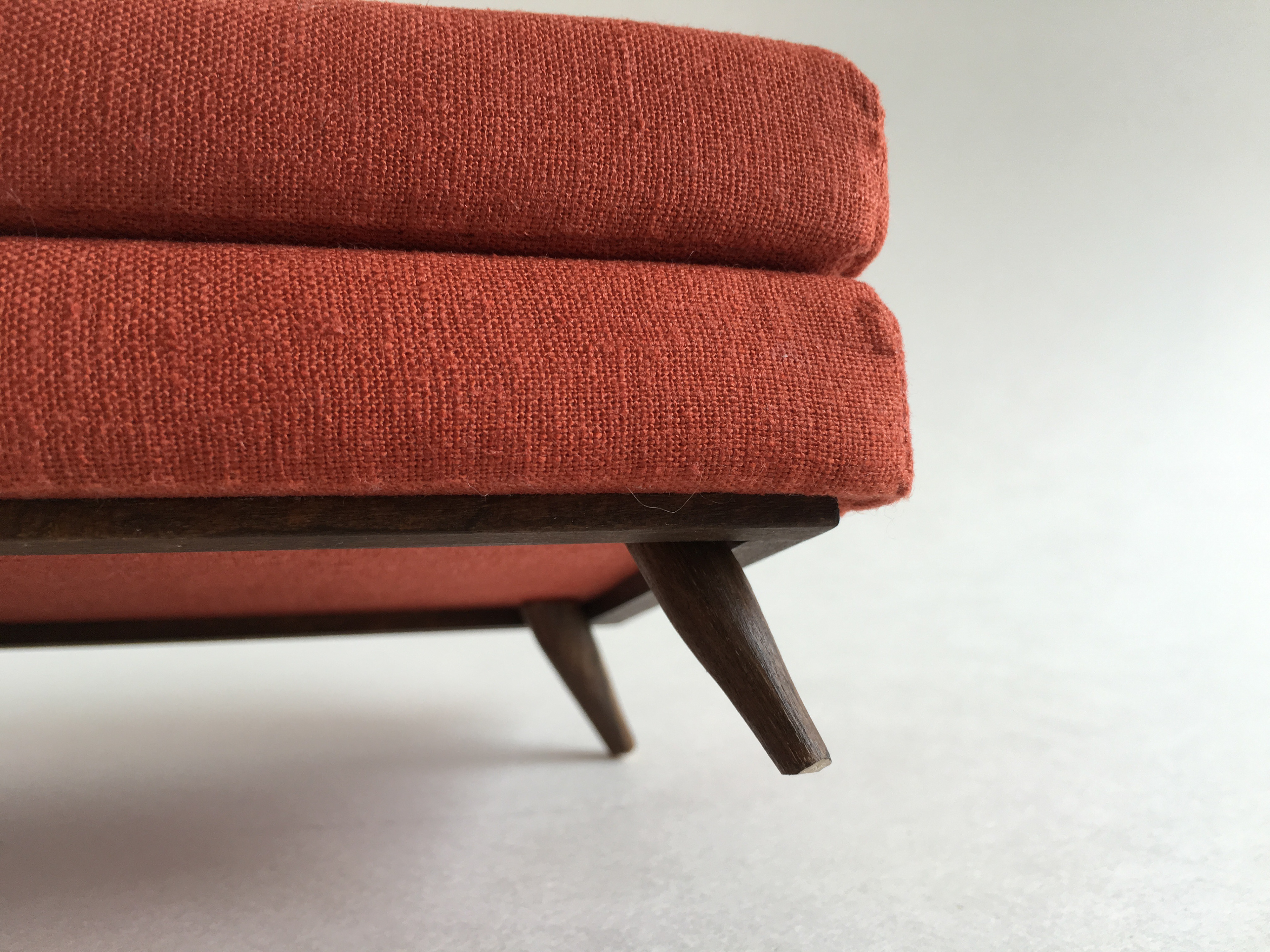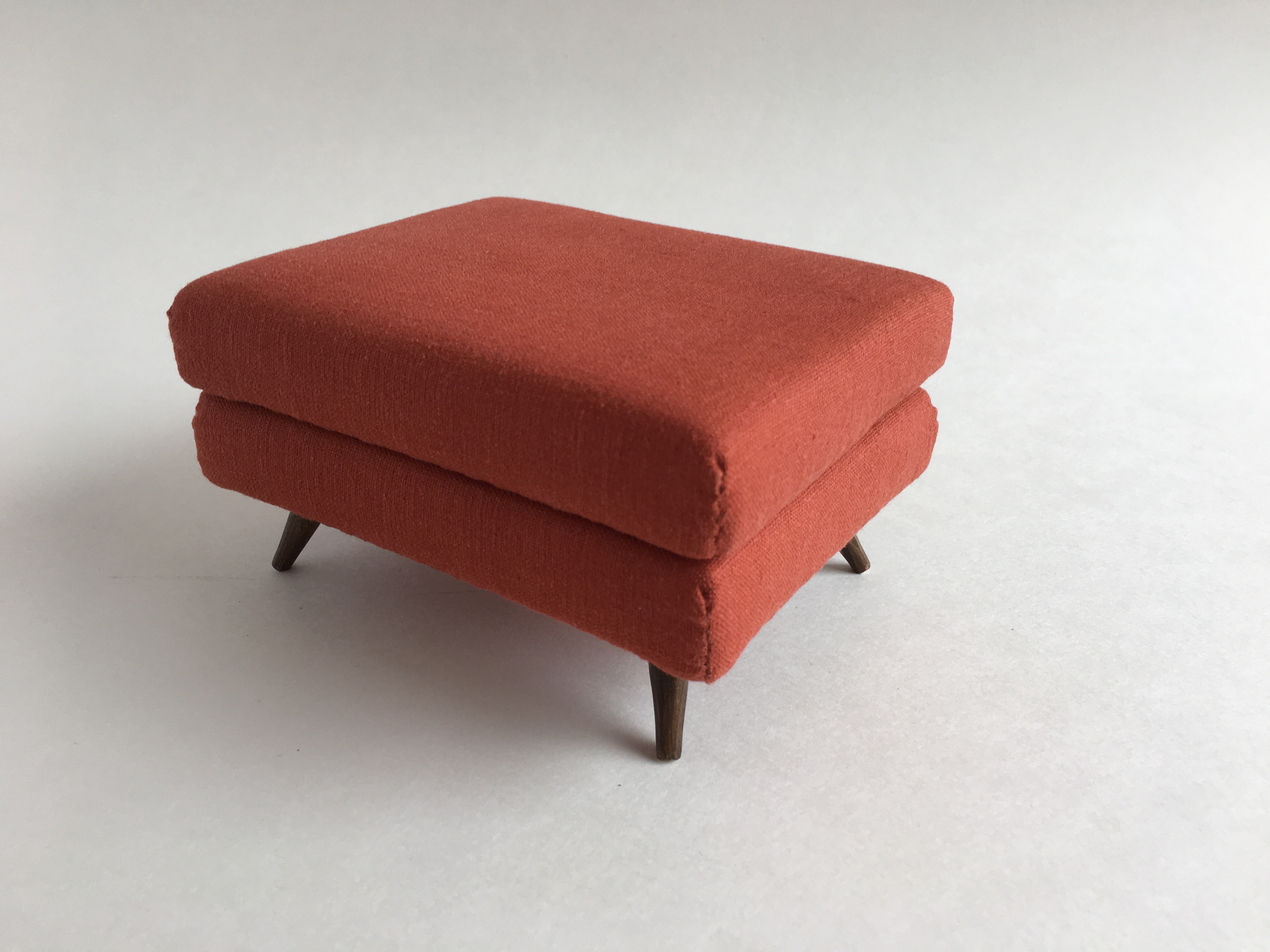 Dennis Ottoman in rust linen fabric with angled tapered legs and wooden under frame. Dimensions: 4.75"x3.75"x2.5"H
