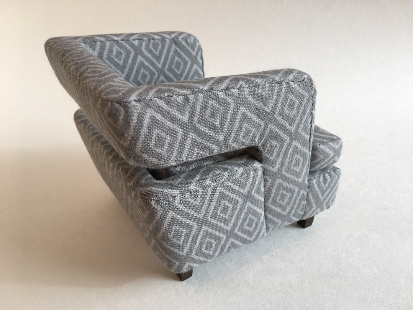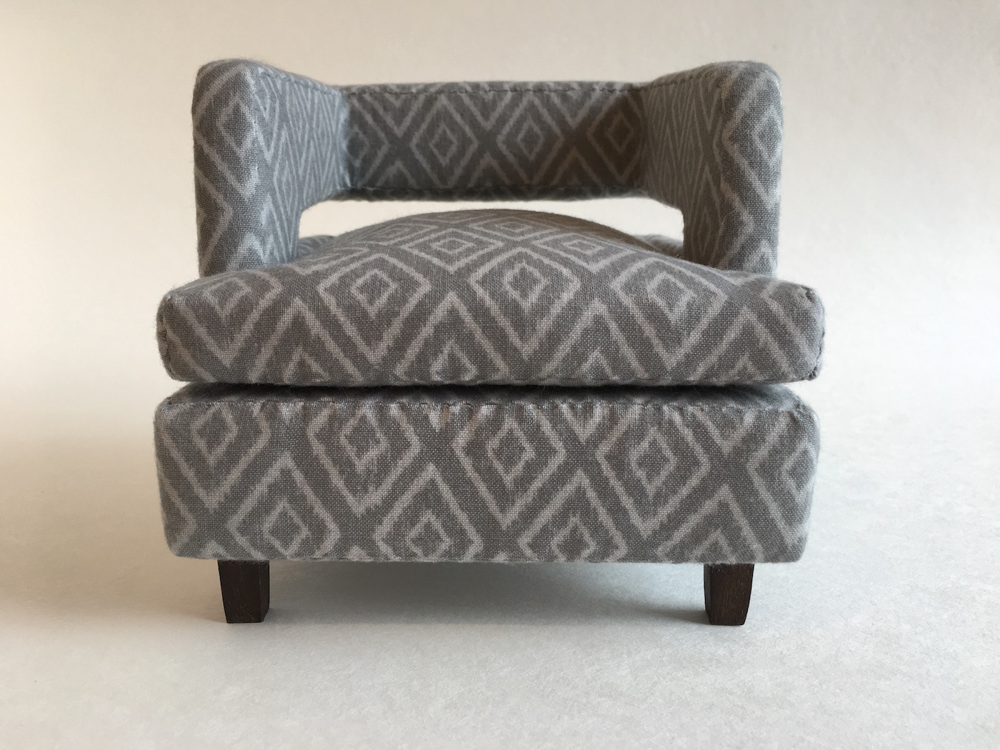 This design features a floating, open back design and removable cushion. Hand carved, stained and waxed bass wood legs. Dimensions 5.25” W x 5.75” D x 4.75” H