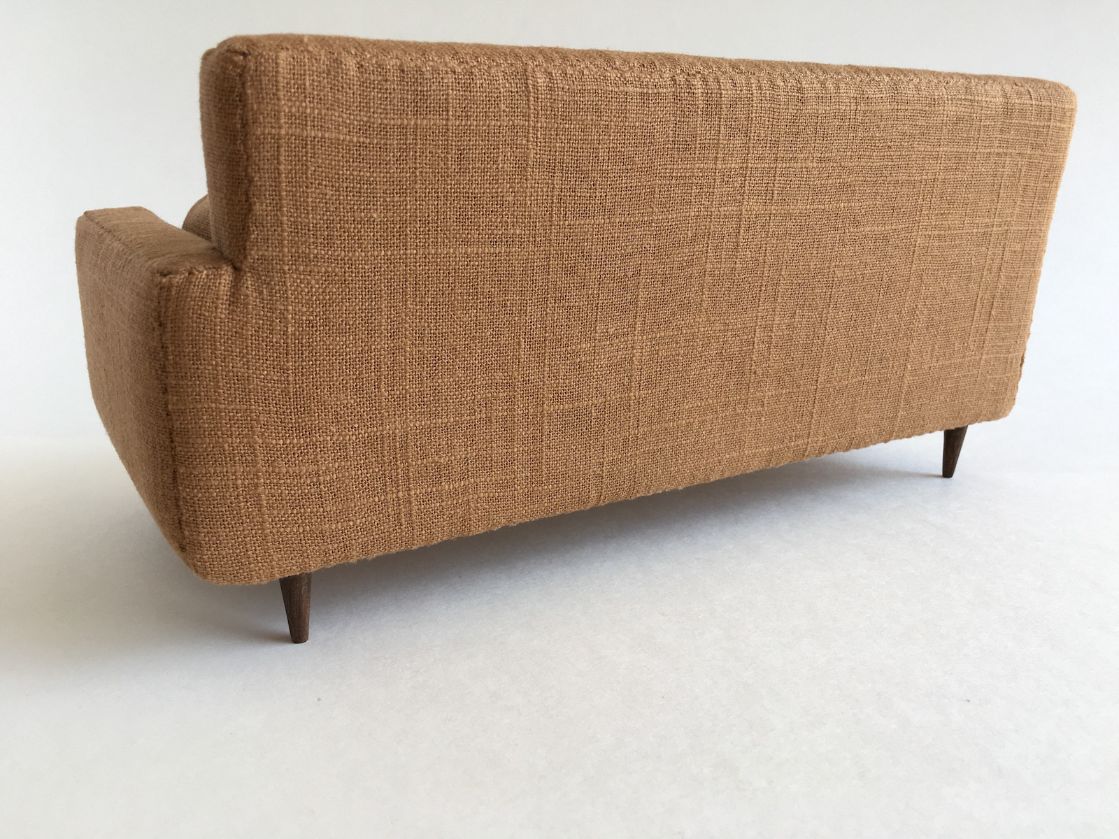 Meet Jasper, our first look at an iconic mid-century sofa design. It is upholstered in a beautiful textured linen fabric with a topstitched and tufted seat back. A one-arm design makes this little sofa perfect in almost any setting. Its low profile is perfect for relaxing. Features include removable cushions, a bolster pillow, and hand-turned stained and waxed hardwood legs. Dimensions: 10.75" W x 5"D.